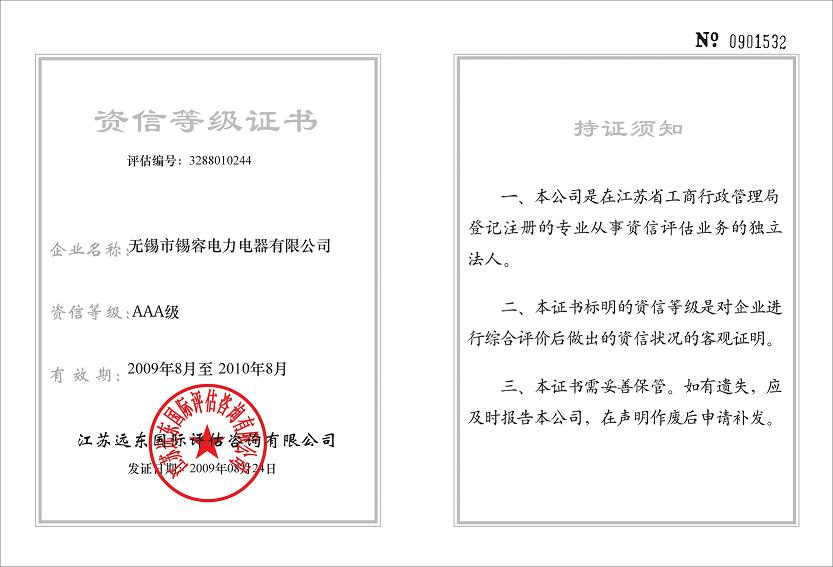Credit rating certificate release time:2020-07-20 04:33:09source:Wuxi Xirong Electric Appliance Co., Ltd.Click:1714
